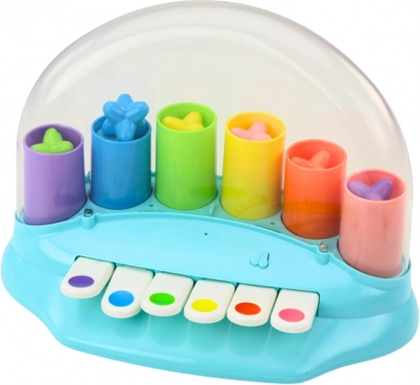 Ogni tasto del pianoforte riproduce un suono melodico e attiva il meccanismo delle stelline a molla. Quando il bimbo preme un tasto, le stelline volano sotto la cupola trasparente creando uno spettacolo affascinante. La cupola guida le stelle cadenti lungo un percorso speciale, così ogni nuova nota riempie lo spazio con una nuova stellina.