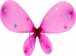 Grandi ali rosa con motivi colorati di farfalle e bordo luminoso. Struttura leggera e fissaggio con elastici per un uso confortevole.
