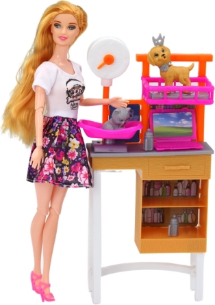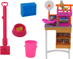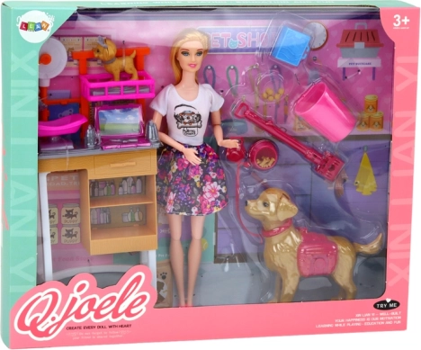 Inclusi vari accessori: stazione di lavoro/toelettatura con ripiani e lettino, ciotole per il cibo, aspirapolvere, cestino, trasportino e un grande cagnolino di plastica con guinzaglio per le “passeggiate”. In modo giocoso sviluppa motricità fine, competenze sociali e immaginazione.
