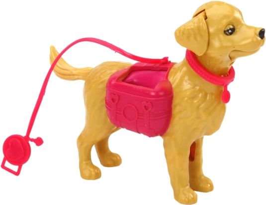 Un grande cagnolino di plastica con guinzaglio e box portaoggetti stimola il gioco attivo e mostra che con i cuccioli fanno parte anche passeggiata e pulizia.