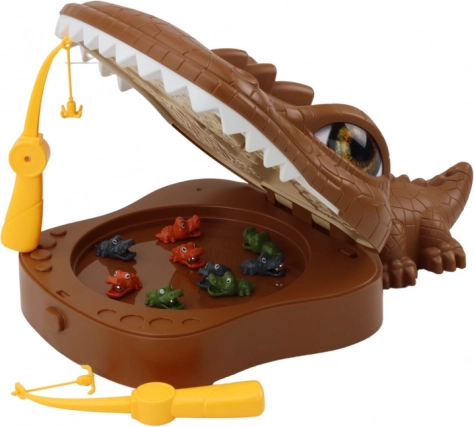 Grande tavola a forma di coccodrillo marrone con bocca apribile, elementi mobili e “prede” colorate per un divertimento senza fine.