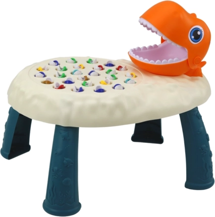 Il simpatico tavolino a tema dinosauro trasforma la pesca in una gara avvincente. La bocca apribile del dinosauro arancione funge da bersaglio in cui i giocatori inseriscono i pesciolini catturati. Durante il gioco i bambini sviluppano precisione, concentrazione e un sano spirito di competizione, divertendosi un mondo.