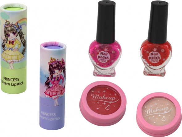 Il ripiano superiore contiene ombretti (opachi e scintillanti), fard e cipria, rossetti, pennellini e applicatori per un trucco semplice. Il ripiano inferiore è dedicato alla cura delle unghie: troverai 2 smalti, limetta, dispenser e unghie finte colorate. Non mancano orecchini clip e un braccialetto per rifinire lo stile.