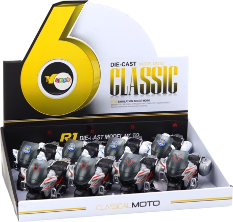 Disponibile in due varianti - polizia e sport. Si prega di scegliere il modello prima dell'acquisto. I singoli giocattoli sono confezionati separatamente, ma il pacchetto contiene 8 pezzi. Le dimensioni della motocicletta sono 17 cm x 10,5 cm x 8 cm. Il giocattolo è certificato CE e soddisfa gli standard EN71. Adatto per bambini dai 3 anni in su.