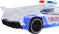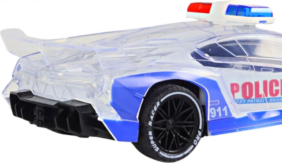 Divertente auto sportiva della polizia con radiocomando in scala 1:16 con carrozzeria trasparente e luci colorate. Grazie al telecomando intuitivo consente manovre precise e una piena gamma di movimenti. Conforme alle norme CE ed EN71, adatta dai 3 anni; alimentazione 4× AA per l'auto e 2× AA per il telecomando (non incluse).