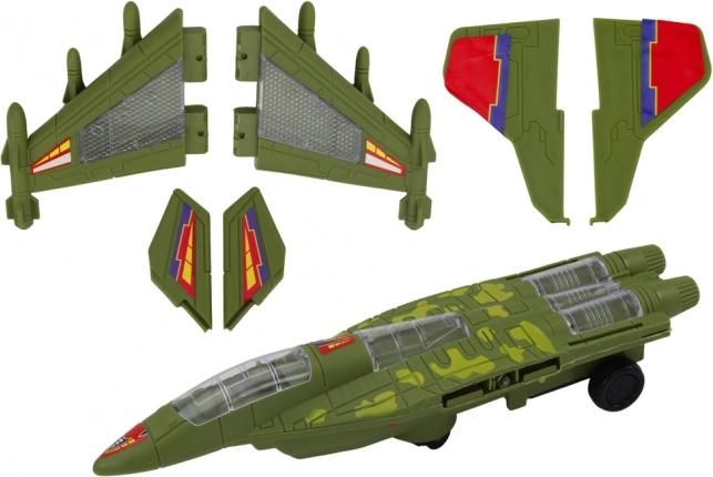 La mimetica verde, le linee aerodinamiche e il cockpit trasparente conferiscono al modello l'aspetto autentico di un vero caccia. Un ottimo complemento per la flotta dei bambini.