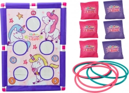 Il gioco è composto da una solida e colorata tavola da gioco decorata con immagini di dolci unicorni, che non solo incoraggia il gioco, ma stimola anche l'immaginazione dei bambini. La tavola include un sistema di punteggio che aggiunge un elemento di competizione ed entusiasmo. Il set comprende sacchetti da lancio progettati appositamente per la stabilità in volo e la precisione del tiro, oltre a colorati cerchi.