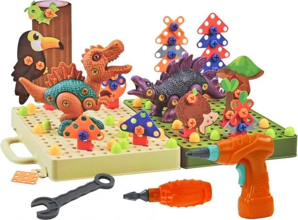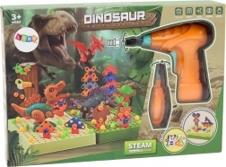 I bambini avvitano e svitano le singole parti dei dinosauri usando un trapano sicuro e facile da maneggiare e gli strumenti in dotazione: ideale per sviluppare la motricità fine.