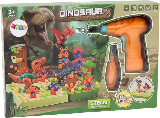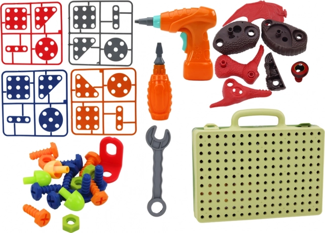 Tutto è riposto in una solida valigetta con base perforata, che funge sia da piano di lavoro sia da contenitore. I bambini possono assemblare i dinosauri preferiti, incluso l’imponente spinosauro, e creare scenari grazie agli elementi in cartone inclusi. Il trapano è alimentato da 2× AA 1,5 V (batterie non incluse).