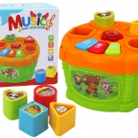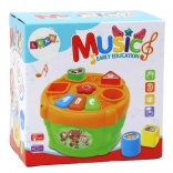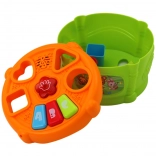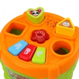 Giocattolo interattivo per bambini a forma di tamburo con design colorato che combina divertimento e apprendimento. È dotato di fori per diverse forme geometriche e pulsanti contrassegnati con 'A', 'B' e 'C', aiutando i bambini a conoscere forme e lettere.