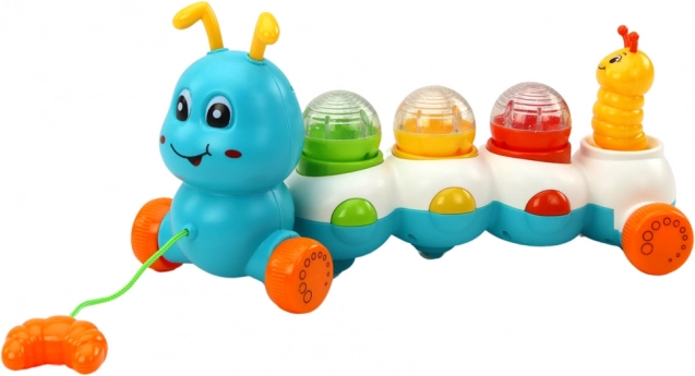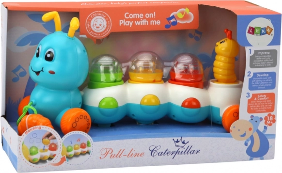 Il bruco trainabile colorato con ruote e cordicella permette al bambino di iniziare a giocare trascinandolo, mentre ascolta melodie allegre. Stimola l'udito e sviluppa abilità motorie durante il trascinamento e la guida del bruco.