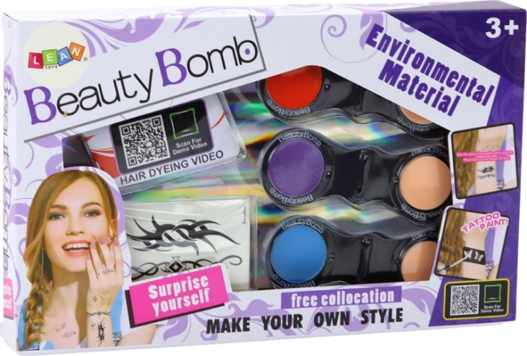 Offriamo un set unico di tatuaggi temporanei e ombre colorate per capelli che offre ore di divertimento e sviluppa la creativit0 dei bambini.