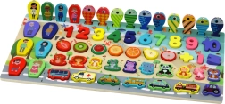 La tavola include diversi sorter che aiutano i bambini a sviluppare il pensiero logico e la coordinazione motoria. Il sorter comprende elementi come mezzi di trasporto, animali, frutta, numeri e membri della famiglia in inglese. Grazie alla varietà degli elementi, il bambino impara a riconoscere e nominare gli oggetti e acquisisce il lessico base dell'inglese.
