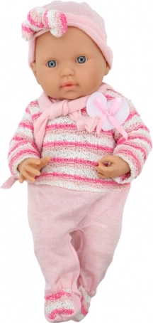 Il pratico set di vestitini include un maglioncino rosa e bianco a righe, una cuffietta con fiocchetto e una sciarpa, che donano alla bambola un aspetto delicato. La bambola è una scelta perfetta come prima bambola dai 18 mesi e rispetta le rigorose norme CE e EN 71.