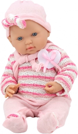 Il maglioncino rosa e bianco a righe con fiocchetto, la cuffietta coordinata e la sciarpa donano alla bambola un aspetto grazioso e stimolano un gioco fantasioso.