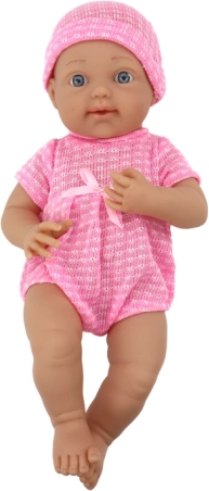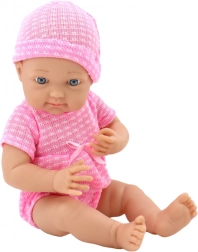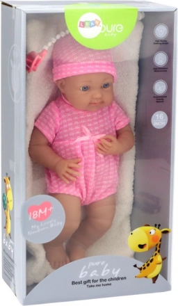 Completo tessile rosa con cuffietta, tratti realistici e occhi azzurri donano fascino alla bambola. Il pratico succhietto con cordino non si perde e arricchisce gli scenari di gioco di accudimento.