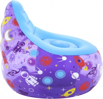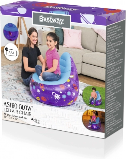 Poltrona gonfiabile leggera e confortevole per bambini con motivo spaziale e suggestiva illuminazione LED. Offre gonfiaggio e sgonfiaggio rapidi, è compatta e adatta per interni ed esterni. Dimensioni 72 × 72 × 64 cm, portata 45 kg, include una toppa di riparazione.