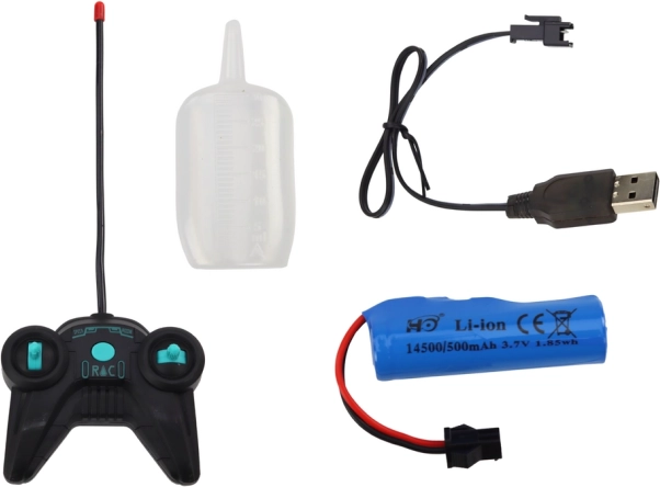 Nella confezione trovi una batteria ricaricabile da 3,7 V e un caricatore USB. Il telecomando funziona con 2× AA (non incluse). Avviamento semplice e immediato.