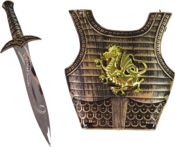 Il set completo del costume da samurai per bambini include un'armatura dorata con motivo drago, facilmente adattabile grazie alle cinghie elastiche. Il costume è dotato di una spada confortevole con diversi disegni sull'impugnatura e di un arco per un tiro preciso a distanza.