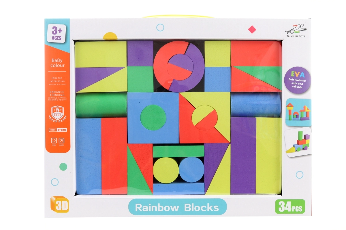 Blocchi in schiuma più rigida di varie forme e colori. Confezionati in una scatola. Dimensioni della confezione ca. 37,5×26,5×4,5 cm. Età 3+