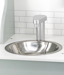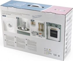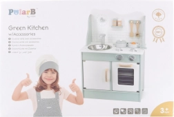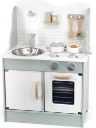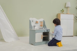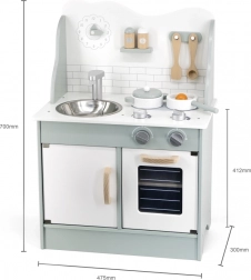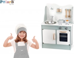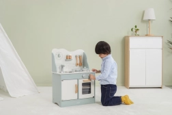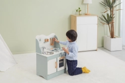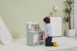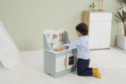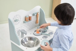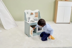 Al termine della cottura, i bambini possono lavare i piatti nel lavello e riporre i cibi nella dispensa sotto il lavello. La cucina per bambini è realizzata in legno verniciato e dipinta con colori non tossici nei toni "polari". Supporta la responsabilità e l'organizzazione durante il gioco.