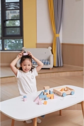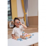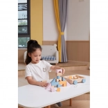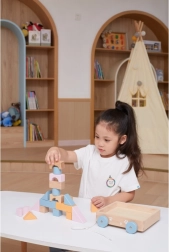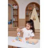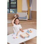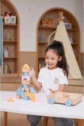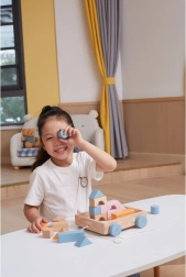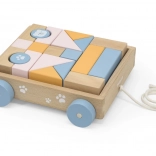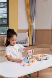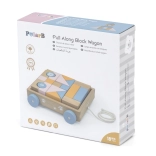 I blocchi sono realizzati in legno di faggio, verniciati con colori armoniosi e sicuri per i bambini. Dopo il gioco, i blocchi possono essere riposti nel carretto, consentendo un facile organizzazione. Grazie alla corda, il bambino può trainare il carretto con i blocchi lungo il pavimento, il che è non solo divertente ma anche pratico.