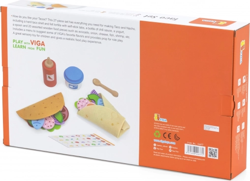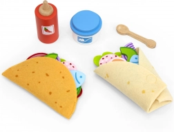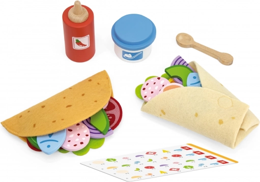 Tortillas, salsa, “yogurt” e oltre venti colorati ingredienti in legno (ad es. avocado, cipolla, formaggio o pesce) permettono ai bambini di creare ogni volta taco e burrito diversi.