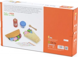 Il set VIGA per taco e burrito offre ai bambini un’autentica esperienza di cucina. Le morbide tortillas in feltro e i vivaci pezzi di cibo in legno (verdure, formaggio, pesce, ecc.) invitano a mescolare i sapori e a creare ricette personalizzate. Grazie agli accessori come la bottiglia di salsa, la ciotolina di “yogurt” e il cucchiaino in legno, il gioco è ancora più vario.
