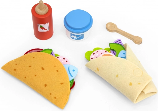 - Tortilla in feltro, guscio taco più rigido, bottiglia di salsa piccante, vasetto di “yogurt”, cucchiaino in legno, circa 20 ingredienti in legno (ad es. avocado, cipolla, formaggio, pesce, ecc.), scheda menu colorata