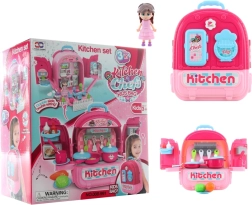 Bellissimo grande set di stoviglie nello zaino, ideale per piccoli chef. Questo giocattolo multifunzionale può servire come set da cucina, set da gioco con bambola o zainetto pratico.