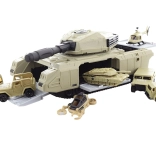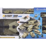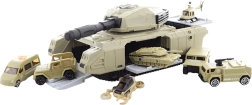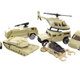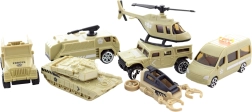 Set militare con un grande carro armato, 6 macchinine e 1 elicottero. Materiale: plastica. Confezionato in scatola. Dimensioni della confezione ca. 46×23,5×11 cm. Età 3+