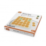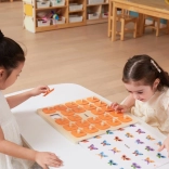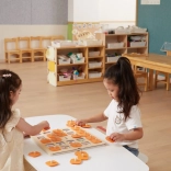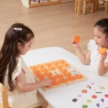 Solida tavola in legno con 25 finestrelle quadrate e coperture arancioni con manici, resistente e comoda per le piccole mani dei bambini.