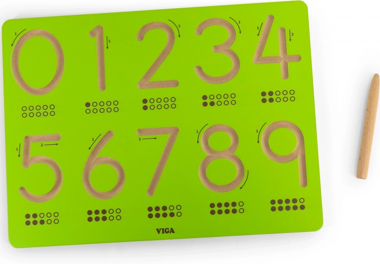 La tavoletta grafomotoria in legno del marchio VIGA aiuta i bambini ad allenare i tratti corretti delle cifre 0–9, sviluppare la motricità fine e la coordinazione occhio–mano. Le guide incise con frecce direzionali mostrano il verso di scrittura e il formato compatto, insieme allo stilo in legno, garantiscono un apprendimento comodo e divertente.