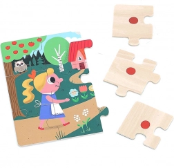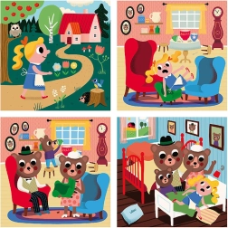 Quattro puzzle separati da 9 pezzi ciascuno raccontano passo dopo passo la fiaba di Raperonzolo, stimolando la fantasia e la capacità di raccontare.