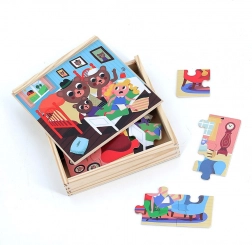 Il set comprende 4 immagini illustrate della storia di Raperonzolo, ognuna composta da 9 pezzi solidi. I bambini allenano concentrazione, memoria e pazienza e, allo stesso tempo, si godono le splendide illustrazioni colorate dal tocco rétro di Ingela P. Arrhenius. Grazie alla realizzazione in legno, i puzzle sono resistenti e adatti alle mani dei più piccoli.