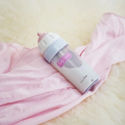 La combinazione di colori rosa e bianco insieme alla pratica scala fanno della bottiglia un autentico accessorio per il gioco.