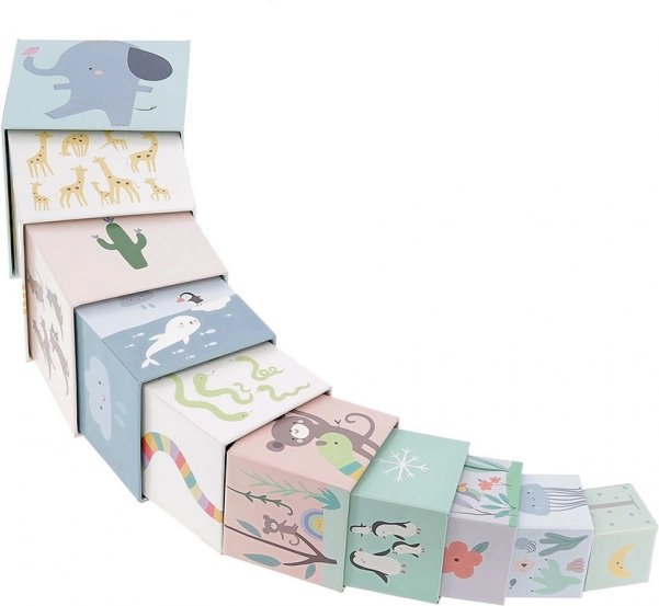 I cubi sono realizzati in cartone di alta qualità, leggero e resistente. Grazie alle dimensioni decrescenti si impilano e si inseriscono con facilità, risparmiando spazio e risultando ideali anche in viaggio. Il design di Sarah Betz sottolinea la componente ludica e stimola fantasia e concentrazione.