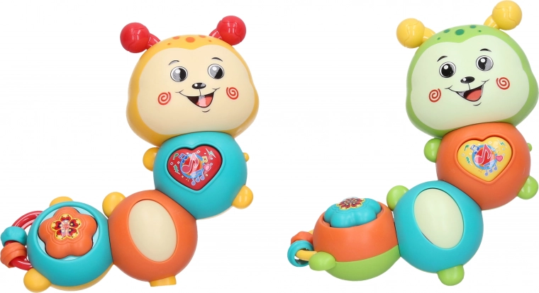 Il sonaglio a forma di bruco offre più di solo divertimento per il tuo bambino. Emette effetti luminosi e sonori, che sviluppano la percezione sensoriale dei bambini. Include: