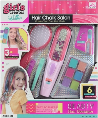 Set per piccole parrucchiere. La confezione include gessetti per capelli, applicatore, spazzola per capelli e due mollette. Confezionato in scatola. Dimensioni confezione ca. 26×31×6 cm. Età 5+