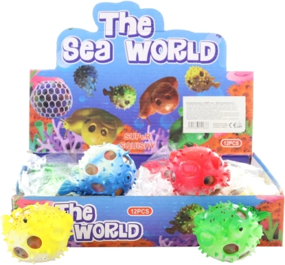 Pallina antistress da schiacciare a forma di pesce palla, dalla quale fuoriesce una massa. Dimensioni circa 9x5x6 cm. Confezionato in sacchetto. Età 3+