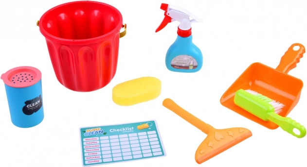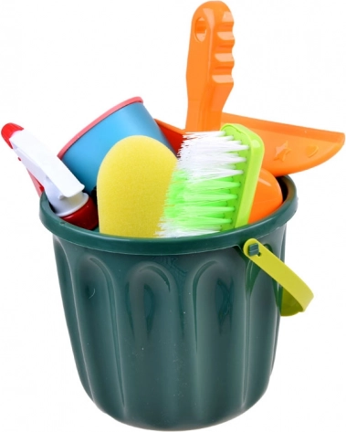 Dotazione completa con secchio, mocio, spazzolina, paletta, spazzola, spugnetta e altri accessori per un gioco di pulizia realistico.
