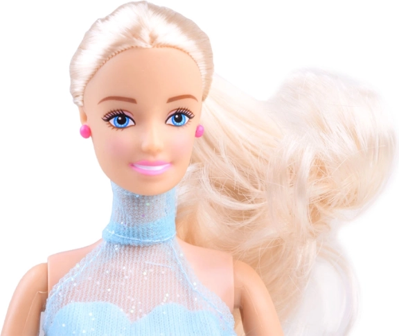 L'abito blu, le scarpette rosa e i lunghi capelli biondi creano un look elegante che i bambini adorano pettinare e personalizzare.