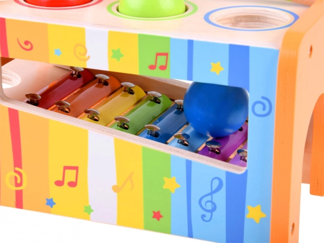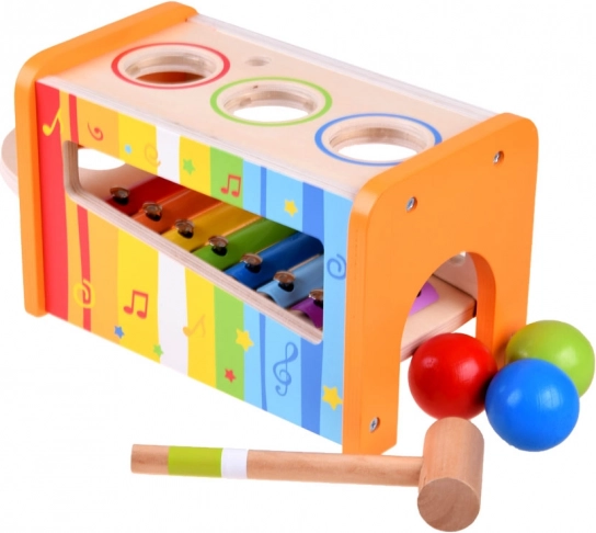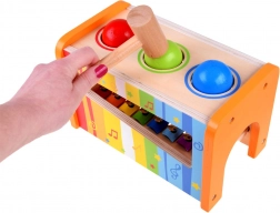 I bambini possono usare il martelletto per battere le palle colorate attraverso i fori della struttura, producendo suoni diversi. Questa attività sviluppa le abilità motorie e la percezione musicale.