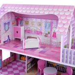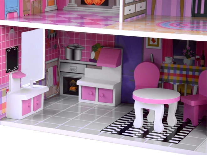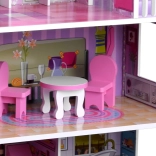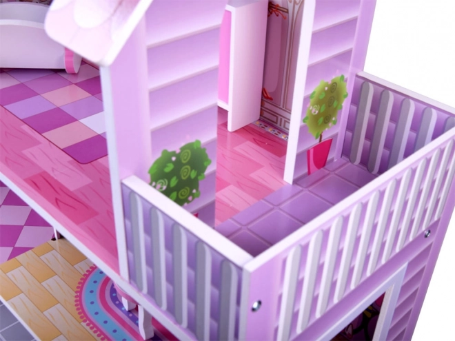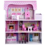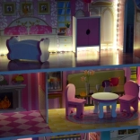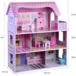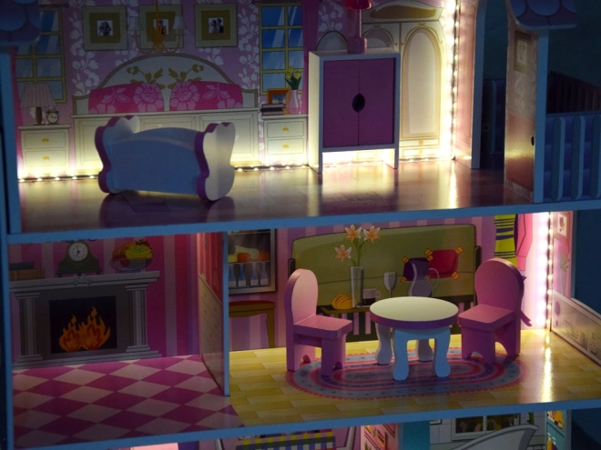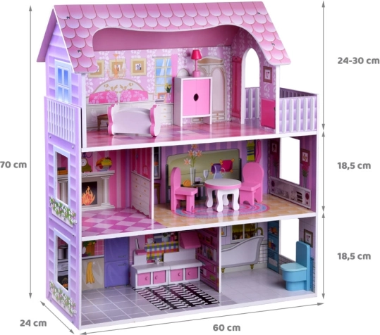 Elegante casetta per bambole in legno con 3 piani e 5 stanze, ricca dotazione di mobili e delicata illuminazione LED. Struttura solida, dimensioni 70 × 60 × 24 cm e montaggio facile in 30 minuti per favorire il gioco creativo con bambole tipo BARBIE e ANLILY.