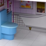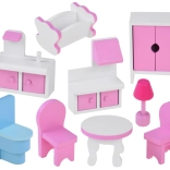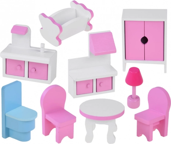- Set di mobili: credenza con cappa e sportelli apribili, mobiletto da bagno con sportelli, WC blu, tavolo rotondo bianco, 2 sedie rosa, armadio bianco con ante rosa, culla, abat-jour e luci LED.
