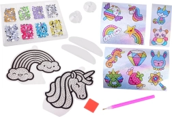 Crea 2 grandi decorazioni da appoggiare o appendere e 12 adesivi glitter con motivi di arcobaleni e unicorni. Perfetti per finestre, quaderni e regali.