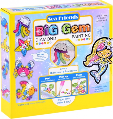Questo set Pittura con diamanti Sea Friends permette ai bambini di creare immagini scintillanti degli amici del mare. Basta rimuovere la pellicola protettiva, prelevare un diamantino con l’applicatore e la cera e posizionarlo in base ai colori sull’adesivo o sulla sagoma adesiva. Se un diamantino viene incollato male, si può facilmente riposizionare prima che asciughi.