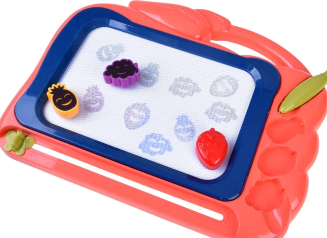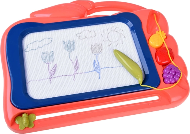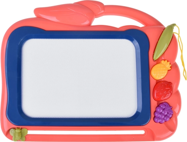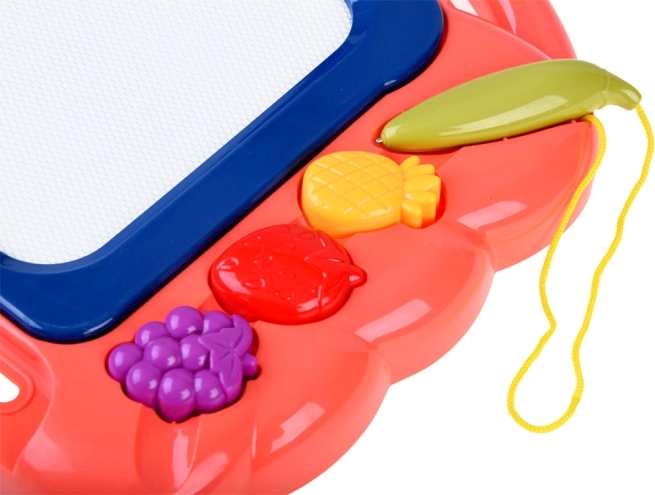 Questa lavagnetta creativa offre uno sfondo colorato su cui i bambini possono creare facilmente disegni con la penna inclusa. Tre timbri a forma di frutta (ananas, fragola e uva) aggiungono dettagli giocosi a ogni creazione, sviluppano la motricità fine e favoriscono la gioia del creare.
