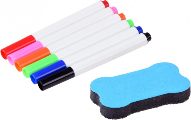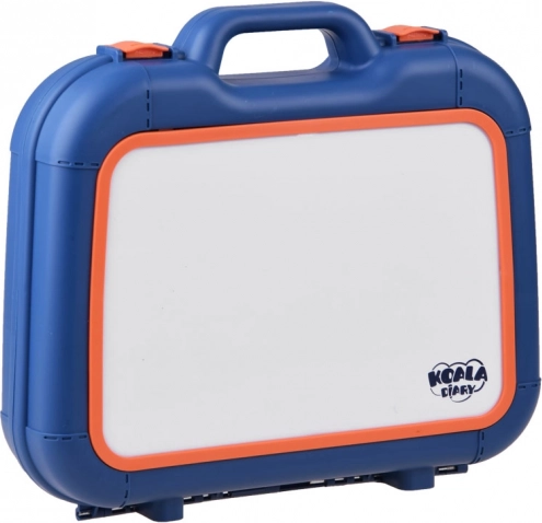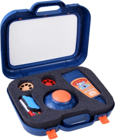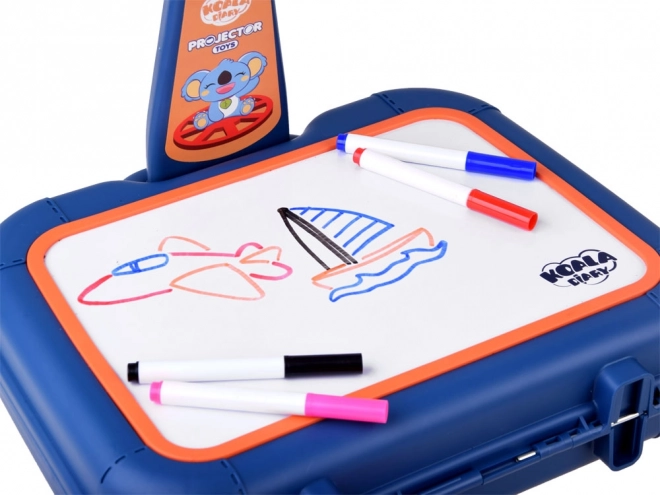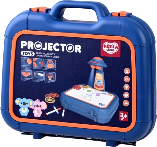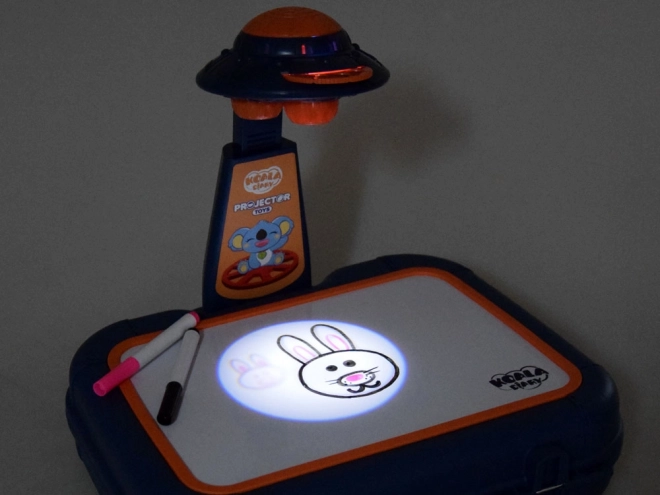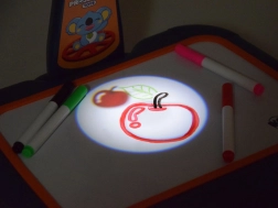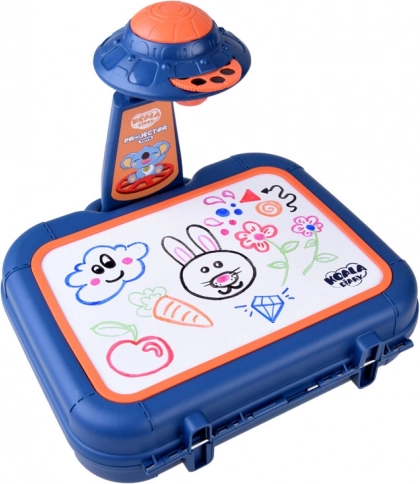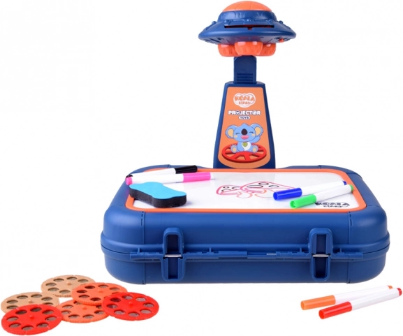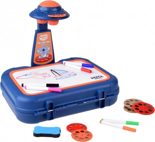 Valigetta con superficie per disegnare, proiettore-lampada, braccio regolabile, 6 dischi con immagini, spugnetta cancellabile e 6 pennarelli.