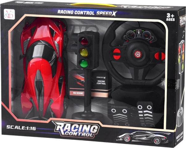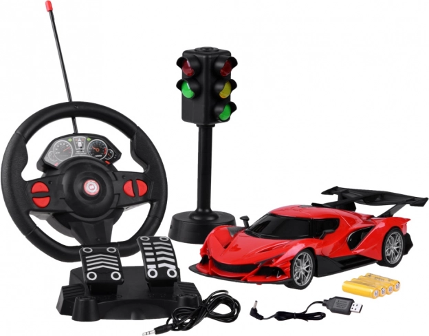 Nella confezione trovi tutto per il divertimento: auto RC, volante, pedali, semaforo, batteria ricaricabile e cavo USB per la ricarica.